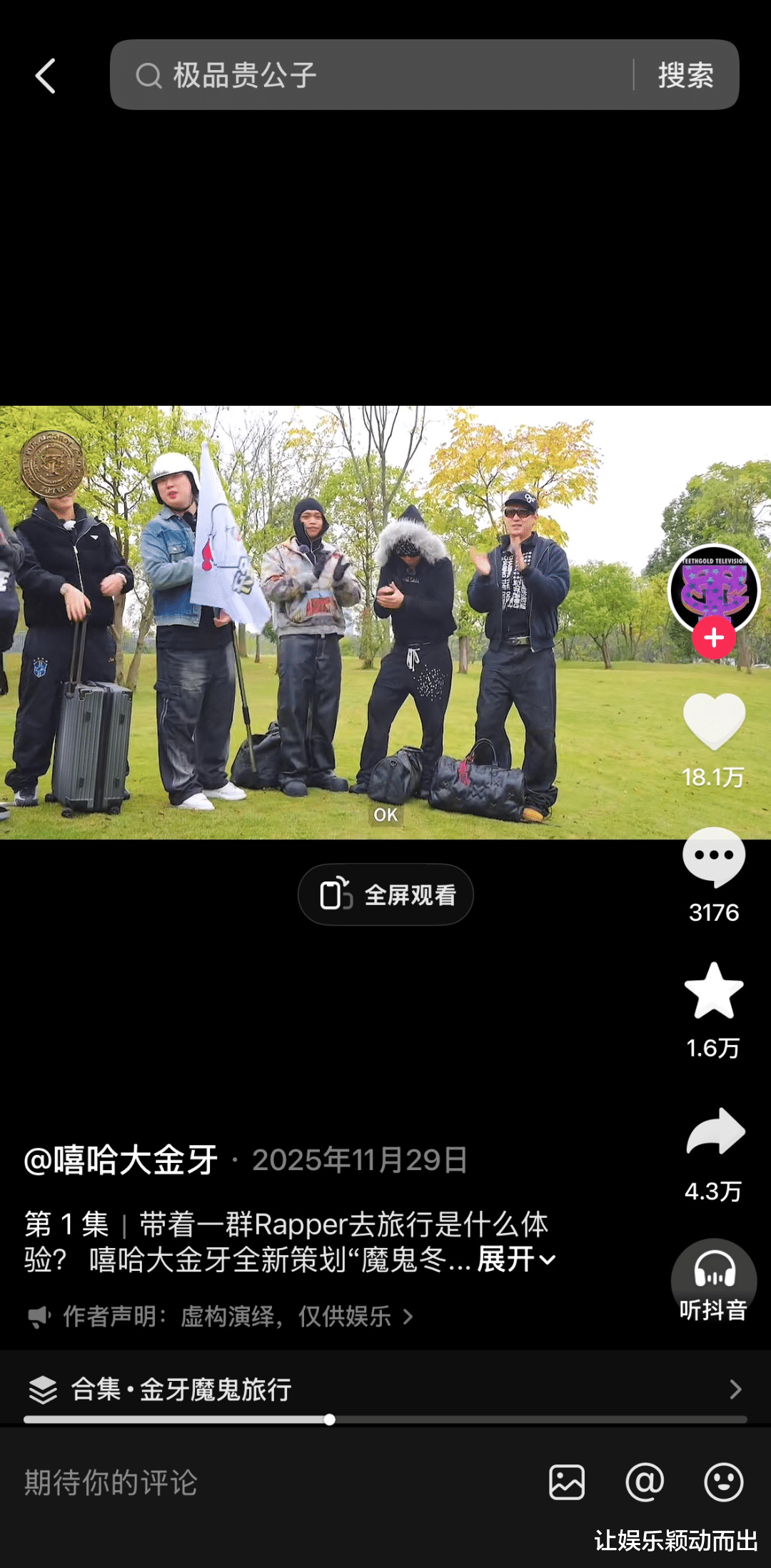 《魔鬼冬游记》只是起点,@嘻哈大金牙的内容探索仍在继续。“最重要的还是消除观众对rapper的刻板印象,让大家看到立体真实的rapper;其次希望与更多艺人、博主联动,把内容做出圈;再就是期望有更多商业机会。”