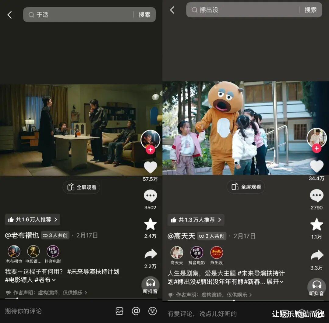 平台的撮合下,不少优秀创作者与资深内容人基于IP共创、交流,《那根棍子》就是由@老布褶也 导演,吴京、于适、熊瑾怡、林秋楠共同出演,延续阐述《镖人:风起大漠》中江湖道义的短片;《爷出没之和孙女的第一面》则是@高天天 基于用户对于熊出没IP情怀的精进创作。