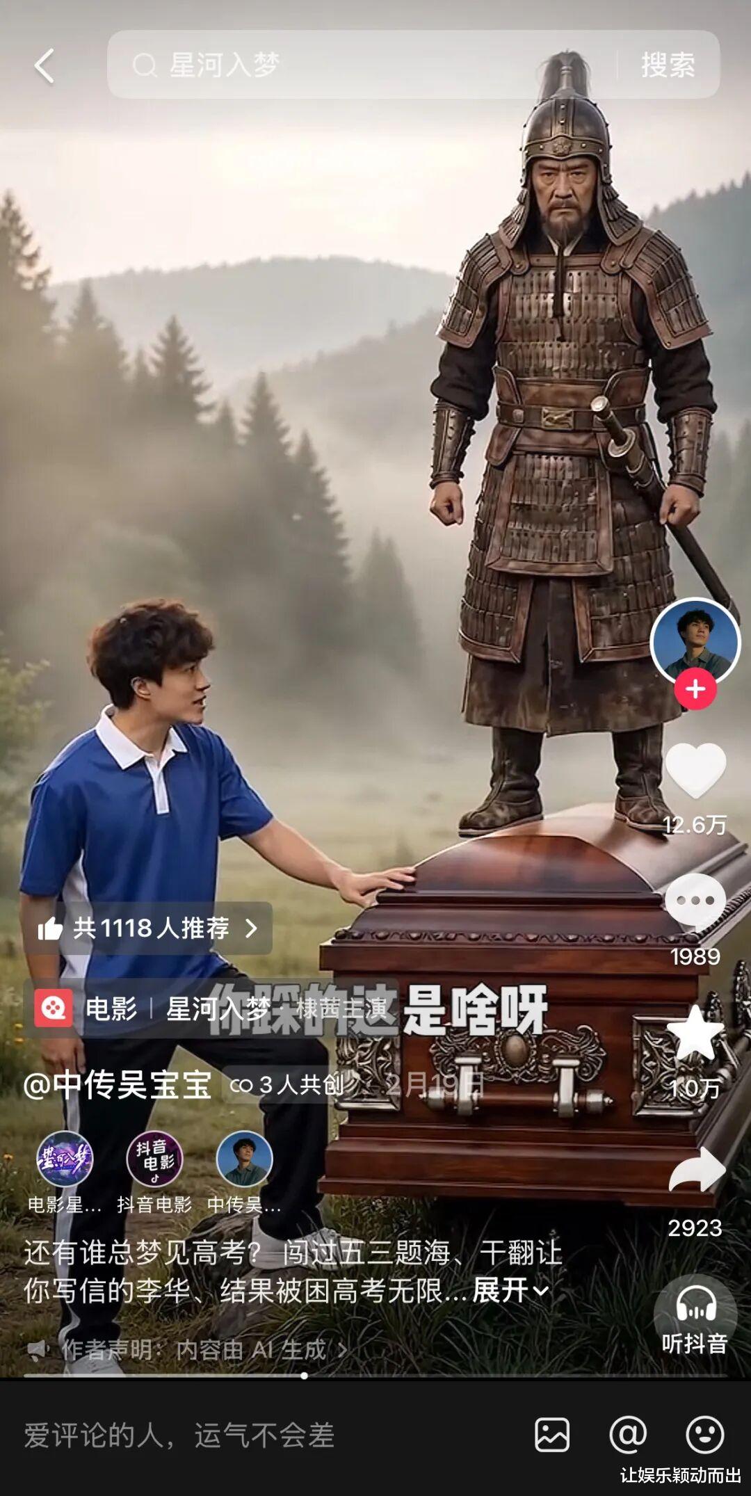 其实平台已经撮合了很多创作者与影视综创作者的交流,《那根棍子》的创作者@老布褶也分享了现场趣事,“吴京拍完之后并没有走,鼓励我们放开了玩,特别支持我们这次合作。而且我发现好几位演员早就看过我们的账号了,这种感觉太奇妙了,一个抖音创作者,永远不知道到底哪些人藏在粉丝数那串茫茫的数字里,被看见的感觉真好。”@中传吴宝宝也与《星河入梦》导演韩延就“电影创作和AI”进行深度对谈。