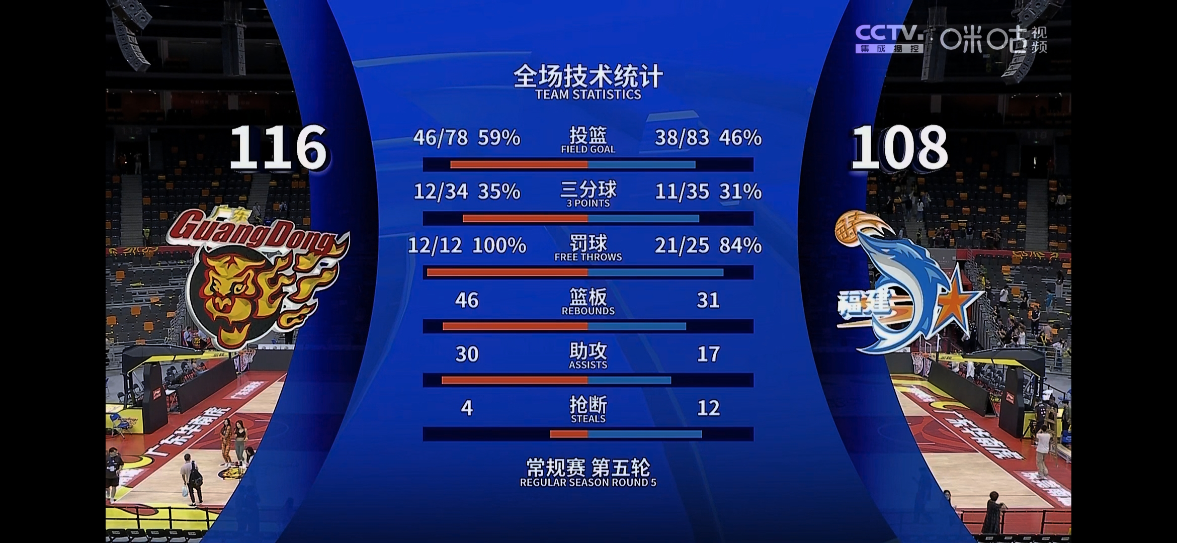 10月23日晚结束的CBA常规赛广东东阳光对阵福建晋江文旅,广东东阳光最终以8分的优势赢得比赛胜利。