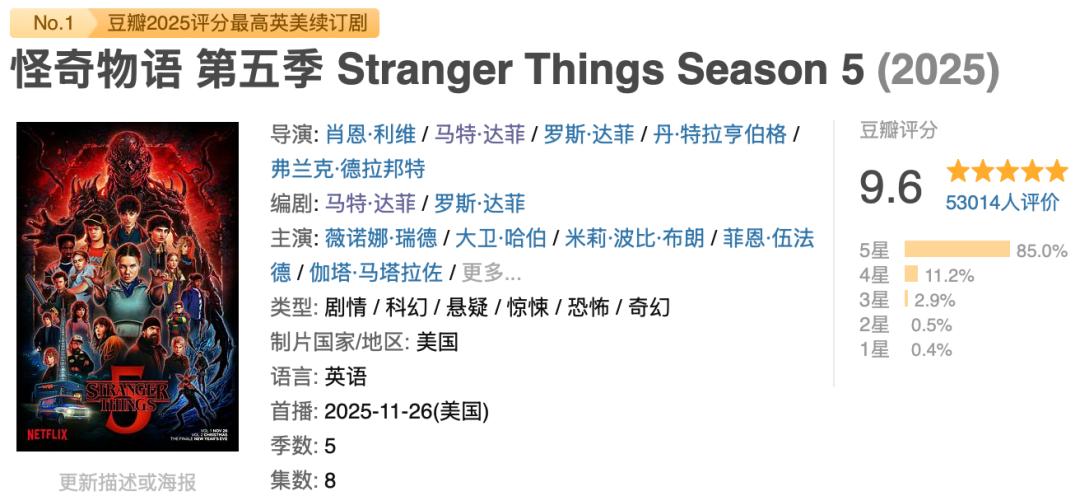 没有烂尾,没有狗血,一切伏笔被严丝合缝填坑。这部《怪奇物语》最终季不仅收获豆瓣9.6分、IMDb评分8.6(第四集9.5分)的高口碑,热度也再次拉爆Netflix服务器,高开炸走。