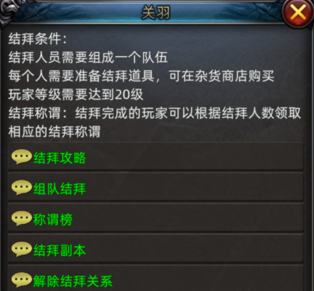 玩家结拜需要组成一个队伍,同时每位玩家都需要达到20级。每位玩家还需要在杂货商店购买结拜道具,然后完成组队结拜。玩家组队结拜之后,会多出一个义气值的属性,义气值可以用来领取称谓。玩家结拜后还可以学习到多种情义技能,进入结拜副本。