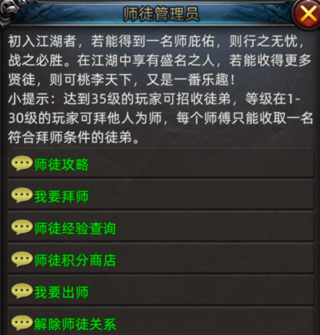 师徒关系需要师傅的等级到达35级,同时徒弟的等级在1-30级,且每个师傅只能收取一名符合拜师条件的徒弟。玩家结为师徒关系后,组队打怪可以获取师徒经验和积分,能够在师徒积分商店中兑换各种资源道具。