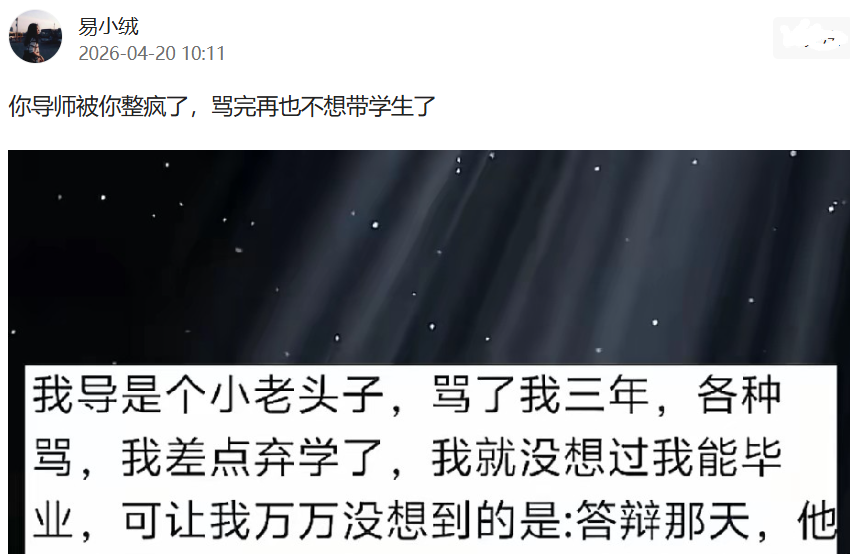 【今日话题】如果让你选,你是愿意要一个平时对你客客气气、从不管你、答辩时让你自生自灭的“佛系导师”,还是愿意要一个平时严格要求、但关键时刻能为你跟全世界翻脸的“严师”?(源自网友@@易小绒短图文,图源网络,侵删)