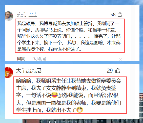 还有个更绝的。网友替师姐系主任去做答辩主席,打眼一瞧,乖乖,周围一圈全是自己的老师。他说:“我只有做签字这件事,一句话也不敢问,更不敢挂他们的学生。”