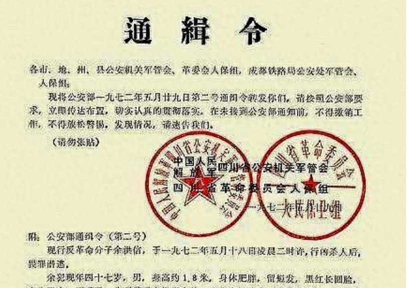 见此情景,两个小伙吓了一跳,撒腿便向大队部跑去。大队书记听了两人的报告,又听说尸体边上有两枝手枪,不由得把目光落到了放在桌子上的那张通缉令上:那是一张盖着省军管会和省革命委员会红色印章的通缉令,被通缉的对象是一位军队高级干部——时任63 军副军长的余洪信。