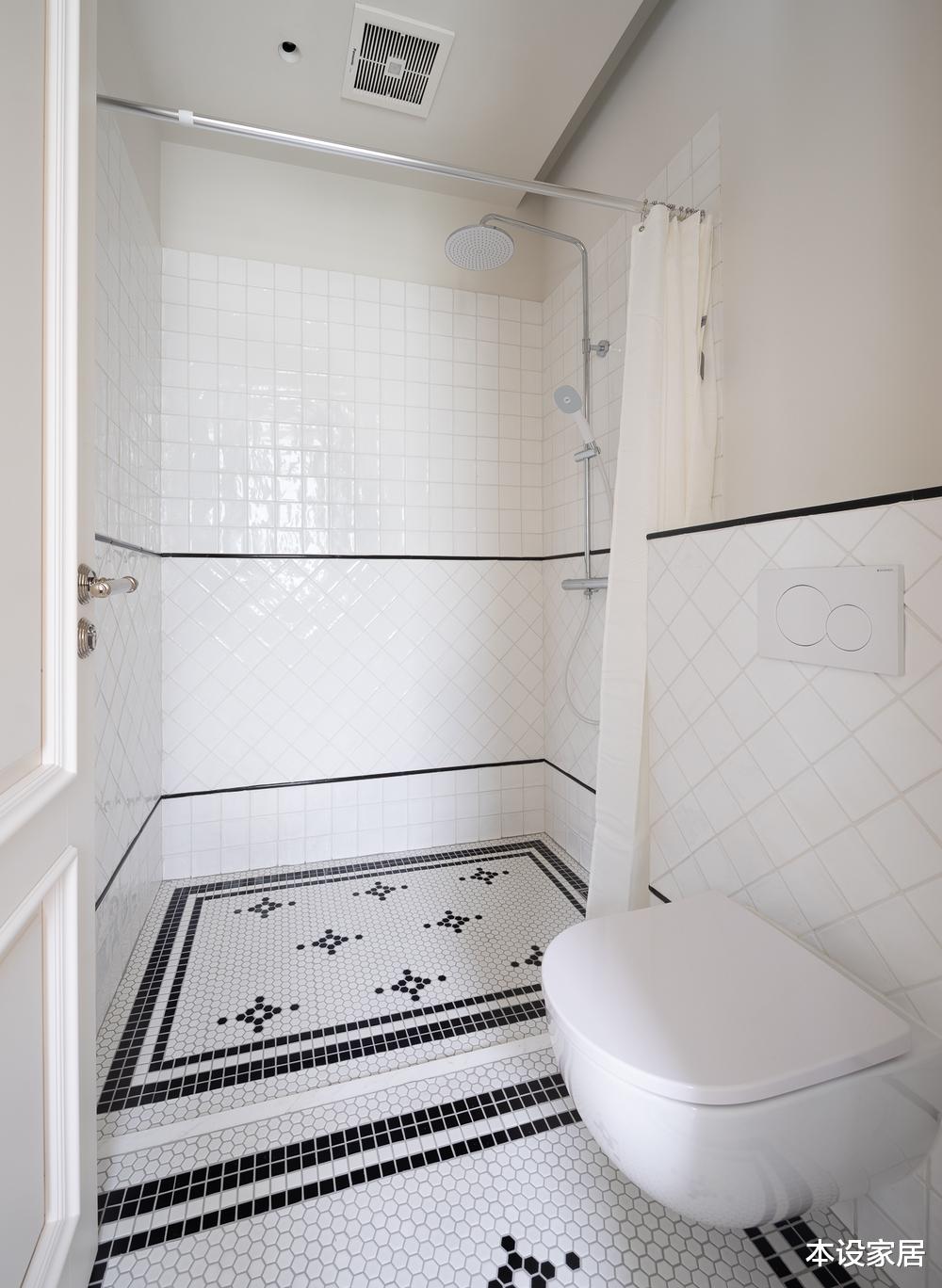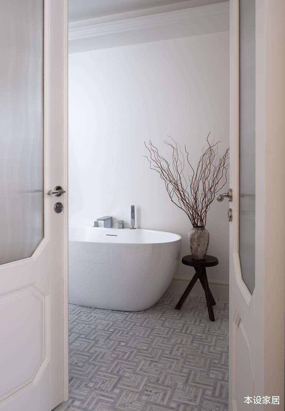 卫生间采用干湿四分离,洗漱台、马桶、淋浴房和浴缸各自独立,并以浅色为主调,地面铺设拼花小砖,搭配墙面斜贴米白色砖,简单又不失氛围感。