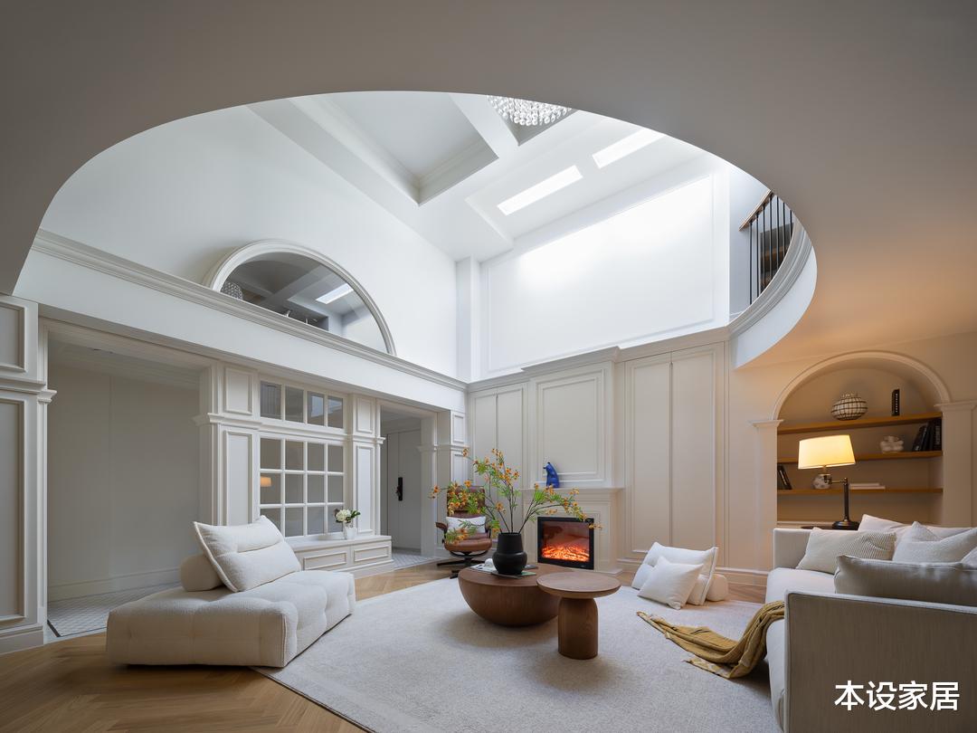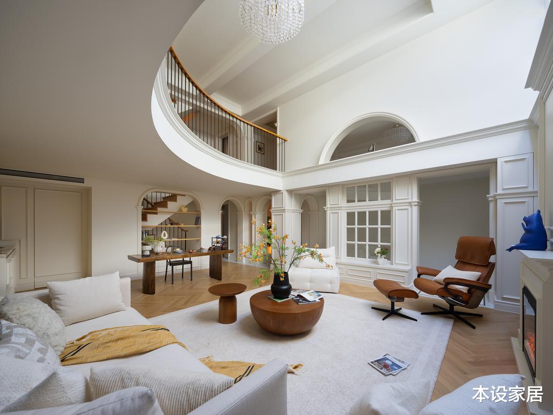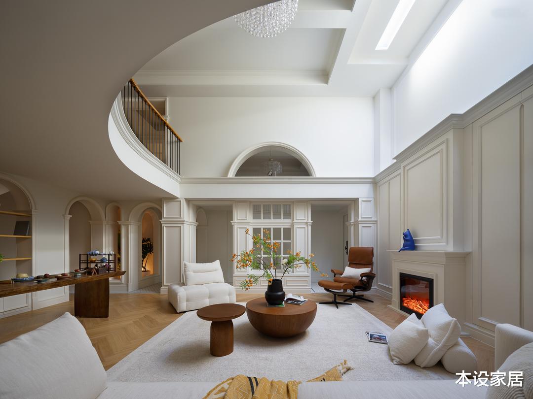 全屋采用偏法式的混搭风格,从客厅可以看出,平面布局打破了法式的固有思维,并融合了当下的审美,对装饰进行删繁就简,挑空圆弧天花的处理,让视觉看起来更加柔和,从不同角度呈现出各异的感官体验。