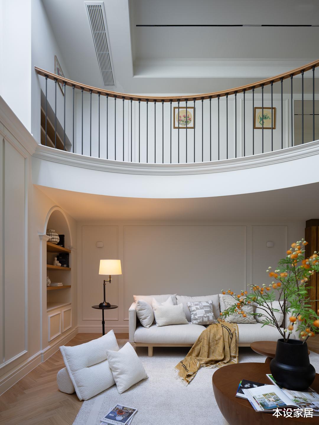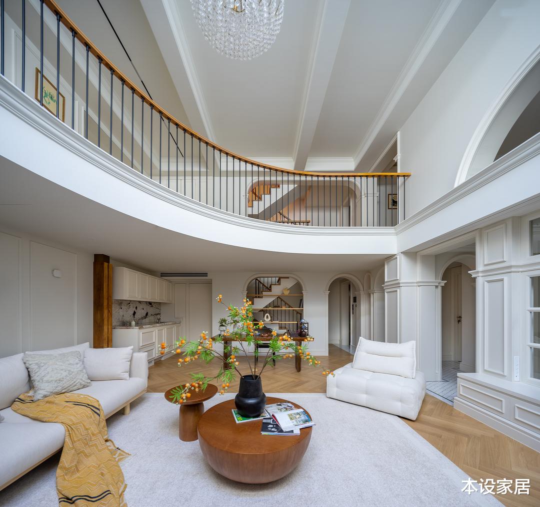 而双层的挑空层高,再加上柔美舒缓的色彩与线条,让人仿佛置身于现代与古典完美融合的宫殿中,处处彰显出屋主对生活的热爱。