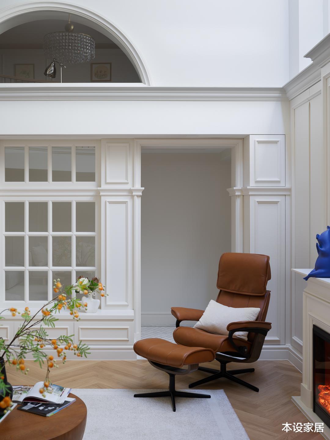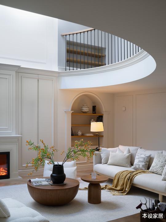 特别是仿真壁炉是空间的精髓,尺寸是根据空间的比例设计的,独一无二,再加上精致的工艺,与米白色的沙发,共同营造出一种浪漫的气质和温馨的氛围感。