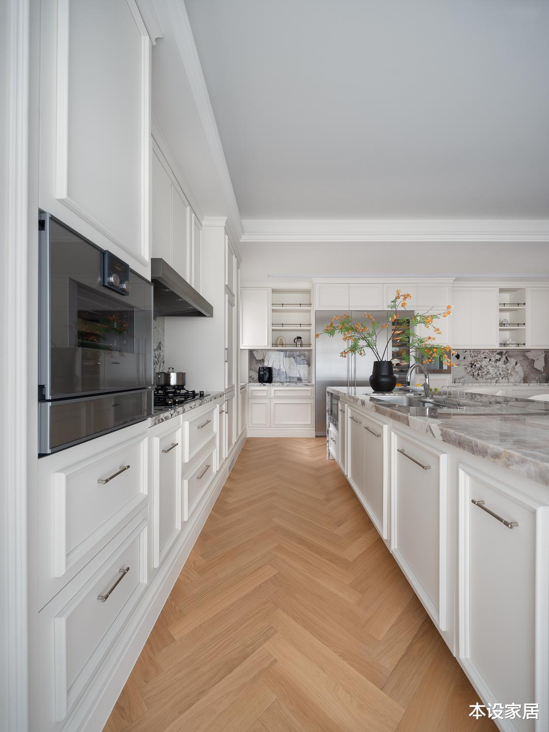 U型的中厨同样选用米白色橱柜,整体风格配色纯净不失复古韵味,操作台面的合理布局,极致每一寸空间,而厨电采用嵌入式的设计,不仅提升厨房功能性,让整体感也更强。