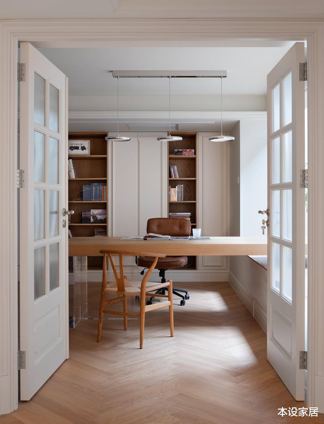 书房采光比较好,装修很简洁,看不到冗杂之形,仅一个长形原木大桌台,能真实感受到实木的温润和温暖的阳光,是生活在喧嚣都市中一处令人沉静的心灵栖所,也可以陪伴孩子读书、办公,共同度过美好的时光。