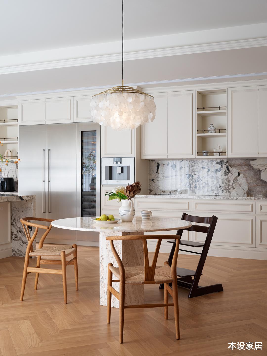 岩板餐桌搭配经典造型的实木餐椅,实用又低调,让其安然舒展地向上生长,而天花下垂的一盏造型优雅的吊灯,宛若一朵即将盛开的花朵,以精致的法式元素,在柔和温暖的灯光烘托下,让视线在不经意间不期而遇。