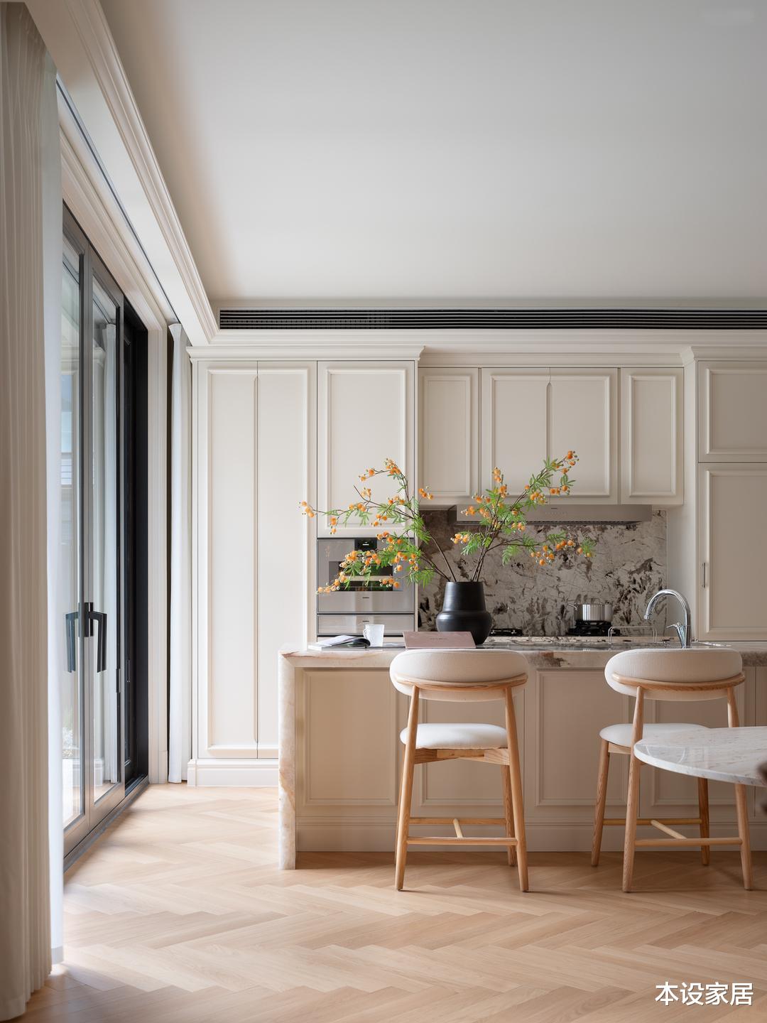 西厨的吧台和高脚椅组合,大理石的自然纹理墙面和乳白色的橱柜,丰富了整个空间的层次感。