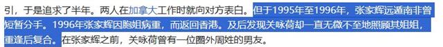 有段时间两人分隔两地短暂分手,张家辉从海外回来的时候发现是关咏荷替他照顾了生病住院的亲姐。