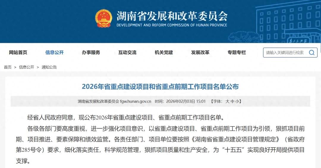 2月3日,湖南省发改委官网公布2026年省重点建设项目、省重点前期工作项目名单,分别有389个和41个。