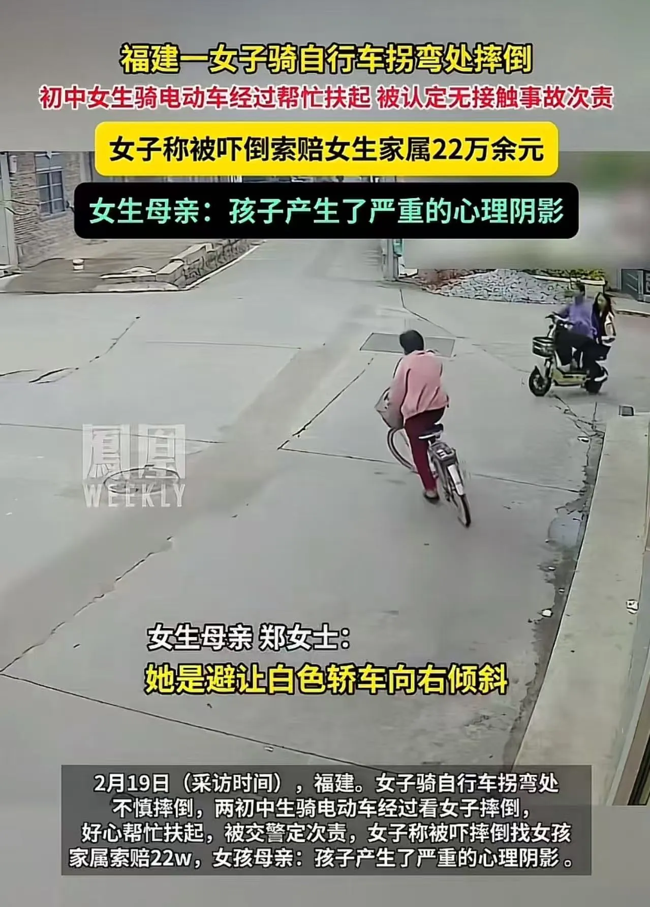 福建这事儿看得人心里堵得慌:一名女子骑自行车在拐弯处避让白色轿车摔倒,两名初中女生骑电动车路过,好心下车把她扶起来,结果被认定为无接触事故次要责任,女子还张口索赔22万。