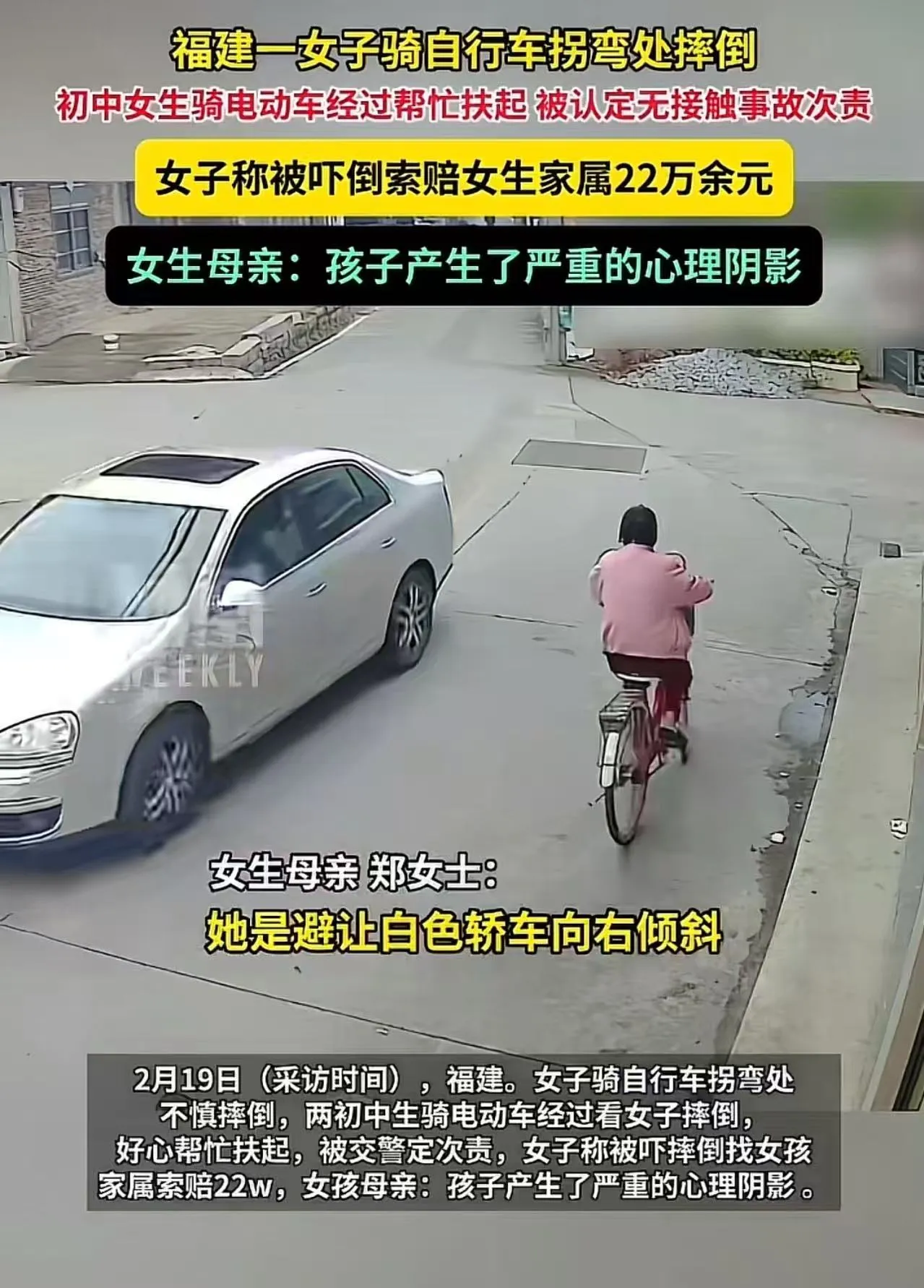 从监控里看得明明白白,女生的电动车和女子的自行车根本没碰到,女子是自己避让轿车重心不稳摔的。俩孩子本来是出于好心,想着“能帮就帮一把”,结果却成了“肇事者”,还要被索赔22万,换谁能接受?