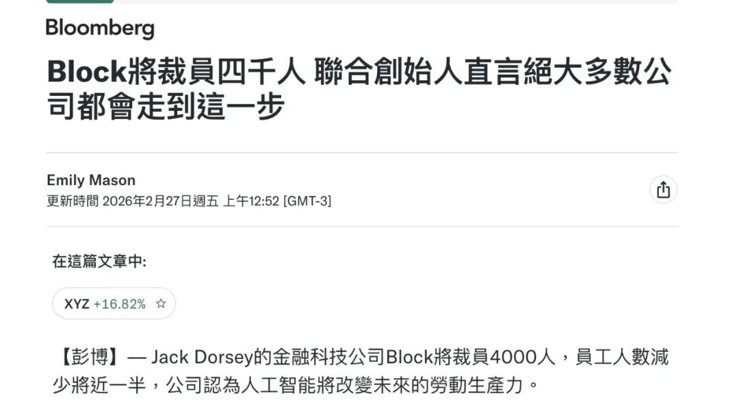 外媒Reuters 的分析师称,这是“AI时代的一个seminal moment(标志性时刻)”,因为Block把AI嵌入运营、主动重构组织,股价因此大涨。