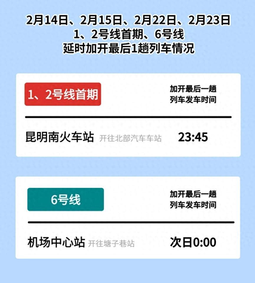 为了保障每一位旅客的顺畅出行,昆明地铁特别制定了春节期间地铁运营服务调整计划,于2026年2月14日、2月15日、2月22日、2月23日,延长部分线路运营时间,并加开列车。