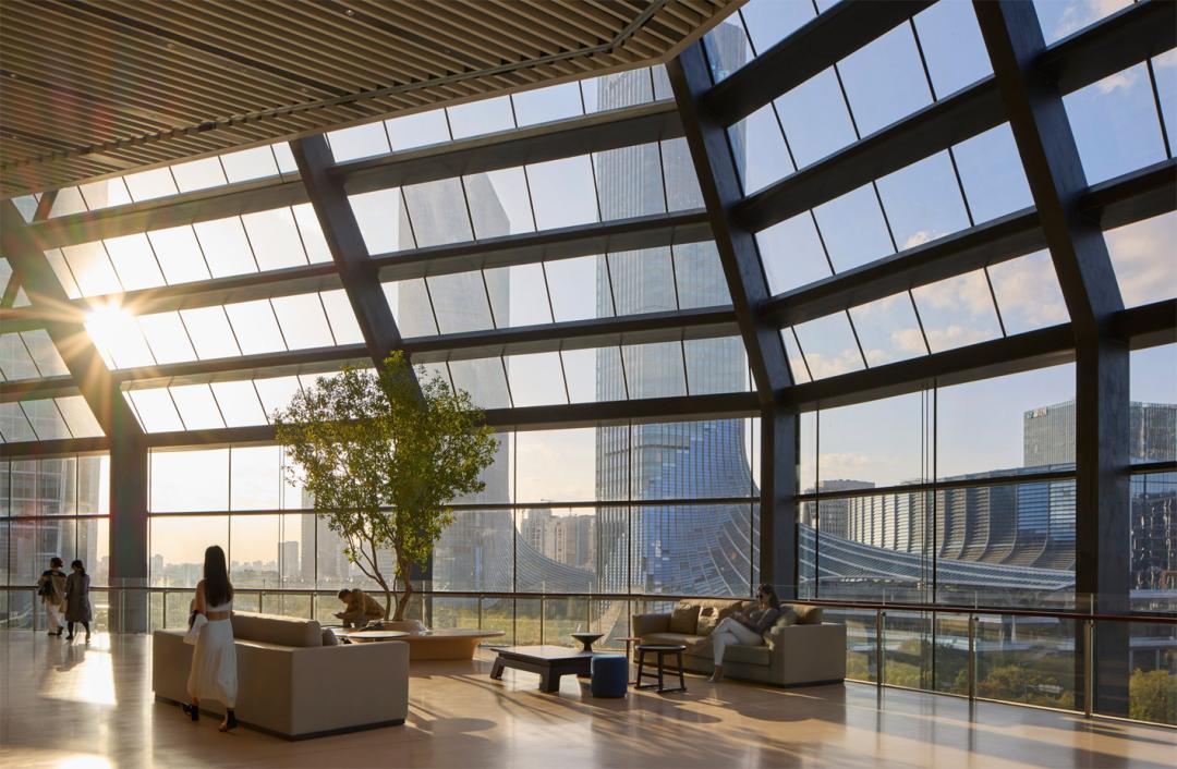 建筑内部以开阔的中庭为核心,自动扶梯将访客缓缓引至上层。主要展厅采用叠放布局,最大一处可提供6000平方米的灵活场地。环绕建筑四周的会议室与公共区域,均配备通透的玻璃幕墙,既引自然光入内,也将江景变为室内背景。此外,建筑还设计了多个被称为“户外房间”的景观露台,拓展了活动的空间层次。