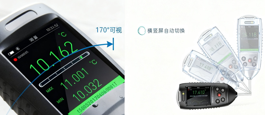 配备高亮显示屏,支持170°可视与横竖屏自适应,可根据光照强度自动调节亮度,室内外使用均清晰;还能查看温度测量曲线,且可开启屏幕旋转功能,适配不同观测与操作需求。