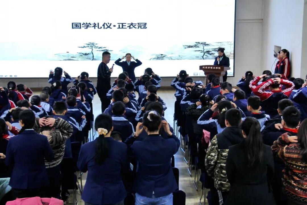 正衣冠,明礼仪,全体同学在礼仪老师的引导下整理衣冠,以整洁之貌、恭敬之心致敬传统,开启新学期的文明之行,让“以礼立身,以行践德”的种子扎根心底。