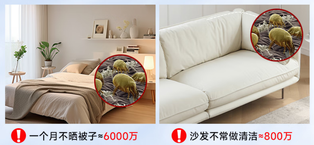 这款产品针对传统除螨仪痛点,搭载HVTOP双擎系统,每分钟12000次高频拍打配合15000Pa负压吸附,深入织物深层拔起螨虫,拍打效率提升200%,除螨率达99.9%。