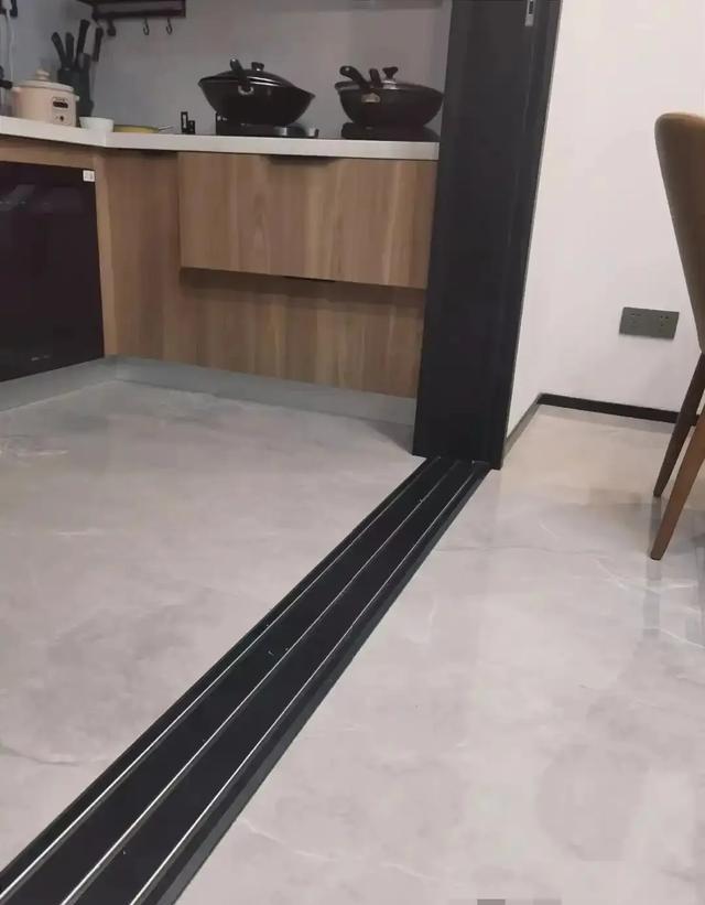 而在装修第二套房时,我将厨房推拉门换成了极简地轨道设计。它避免了吊轨门卡顿的问题,它更便于清洁。