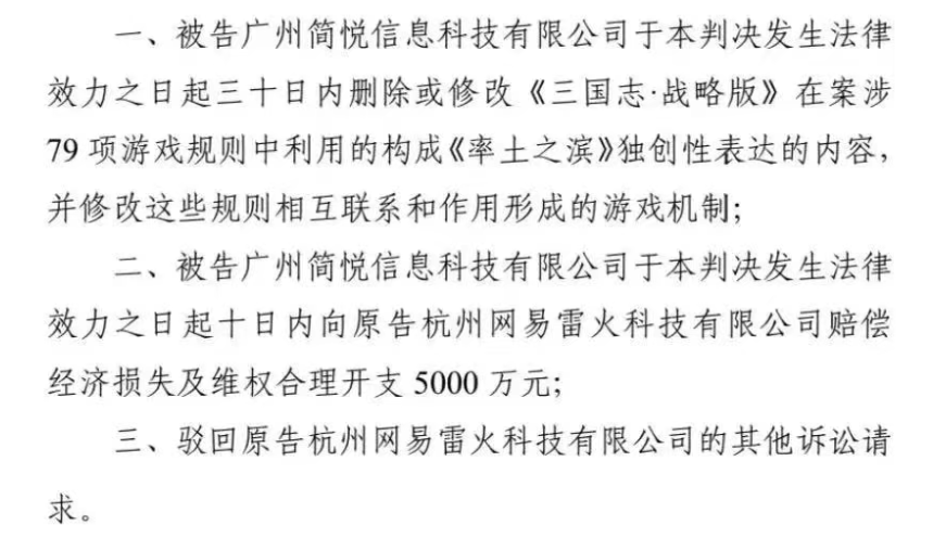 2023年5月,广州互联网法院的一审判决终于来了,认定《三国志・战略版》构成著作权侵权,不仅要删改侵权内容,还得赔偿网易5000万元。