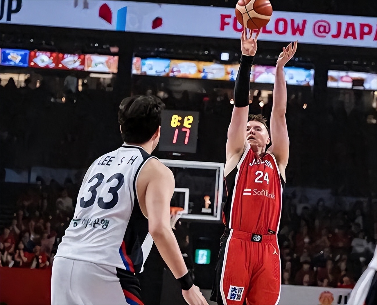 第二节进攻稍有起色,渡边雄太罚球反超比分,李贤重打出精彩3+1,富永启生和渡边雄太连得4分打停韩国队,随后李贤重三分续火,霍金森内线连续得分,两队比分始终紧咬,节末日本队稍稍拉开差距,半场以42-38领先4分,霍金森半场砍下15分,成为日本队最稳定得分点。