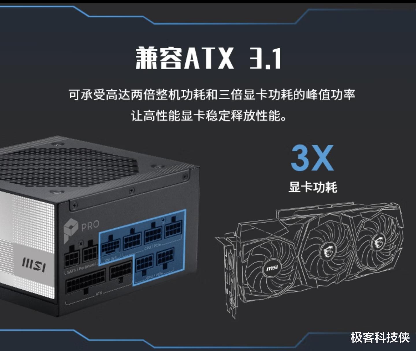 其中ATX3.1规范的核心在于显著提升电源的瞬时峰值供电能力。根据标准,电源需能承受显卡峰值功耗的3倍,以及整机峰值功耗的2倍。这一设计确保了在进行高强度游戏、复杂计算等高负载场景时,系统供电更加稳定,有效避免电压波动,从而保障性能持续输出,运行更流畅可靠。