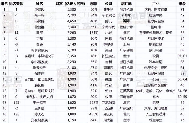 而腾讯创始人马化腾则是排在第3位,54岁身家4650亿元,财富增长了48%。