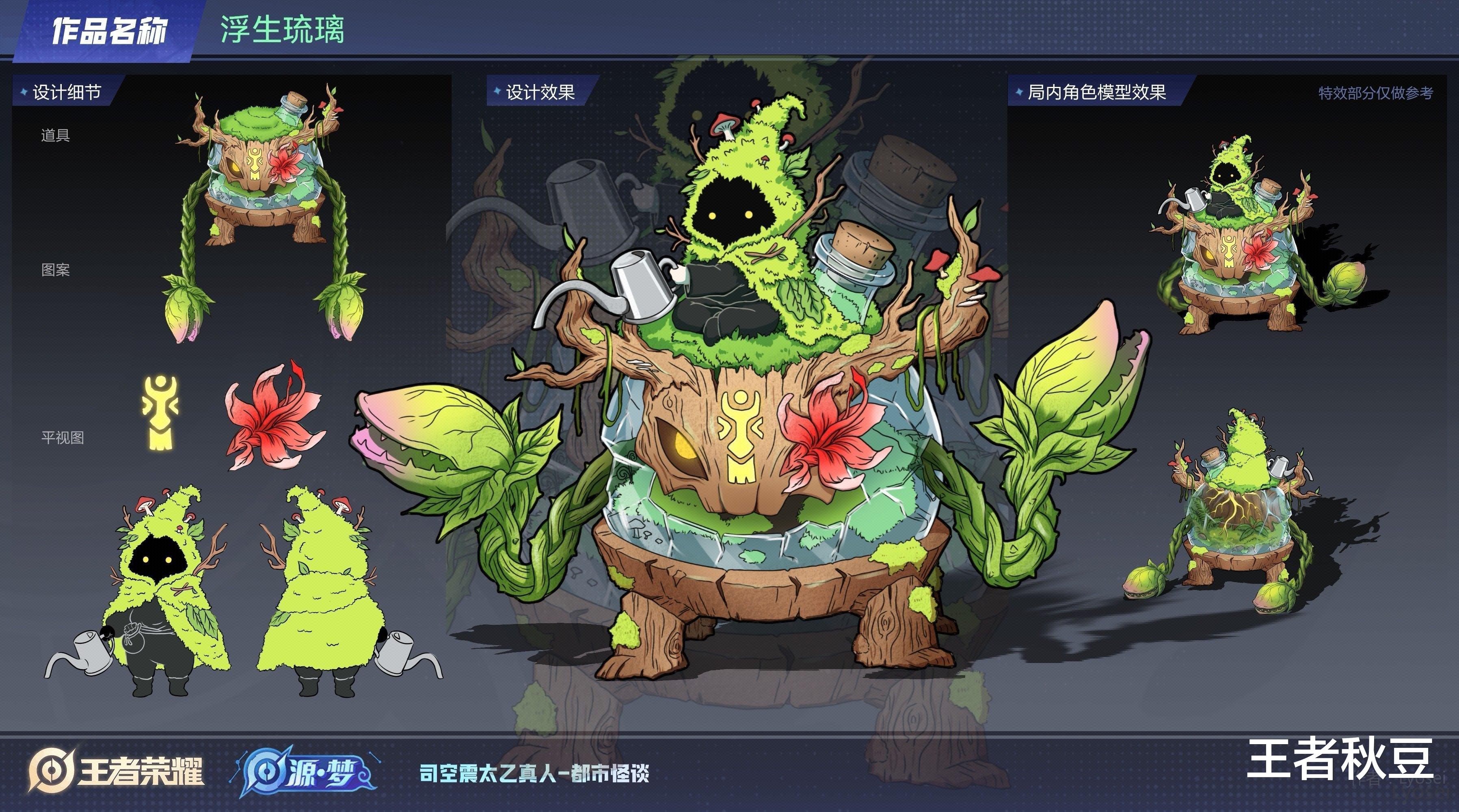 这款作品的主题很有寓意,太乙化身成都市被遗忘植物的植物的苔藓精灵,骑着化生为微景观瓶的坐骑,然后拯救被丢弃的濒死绿植,守护那些脆弱的植物生命。人物设计虽然简单,太乙披着绿植披风帽子,手里拿着水壶,但是整体让人非常舒服。座骑的炉子的食人花可能需要修改下。