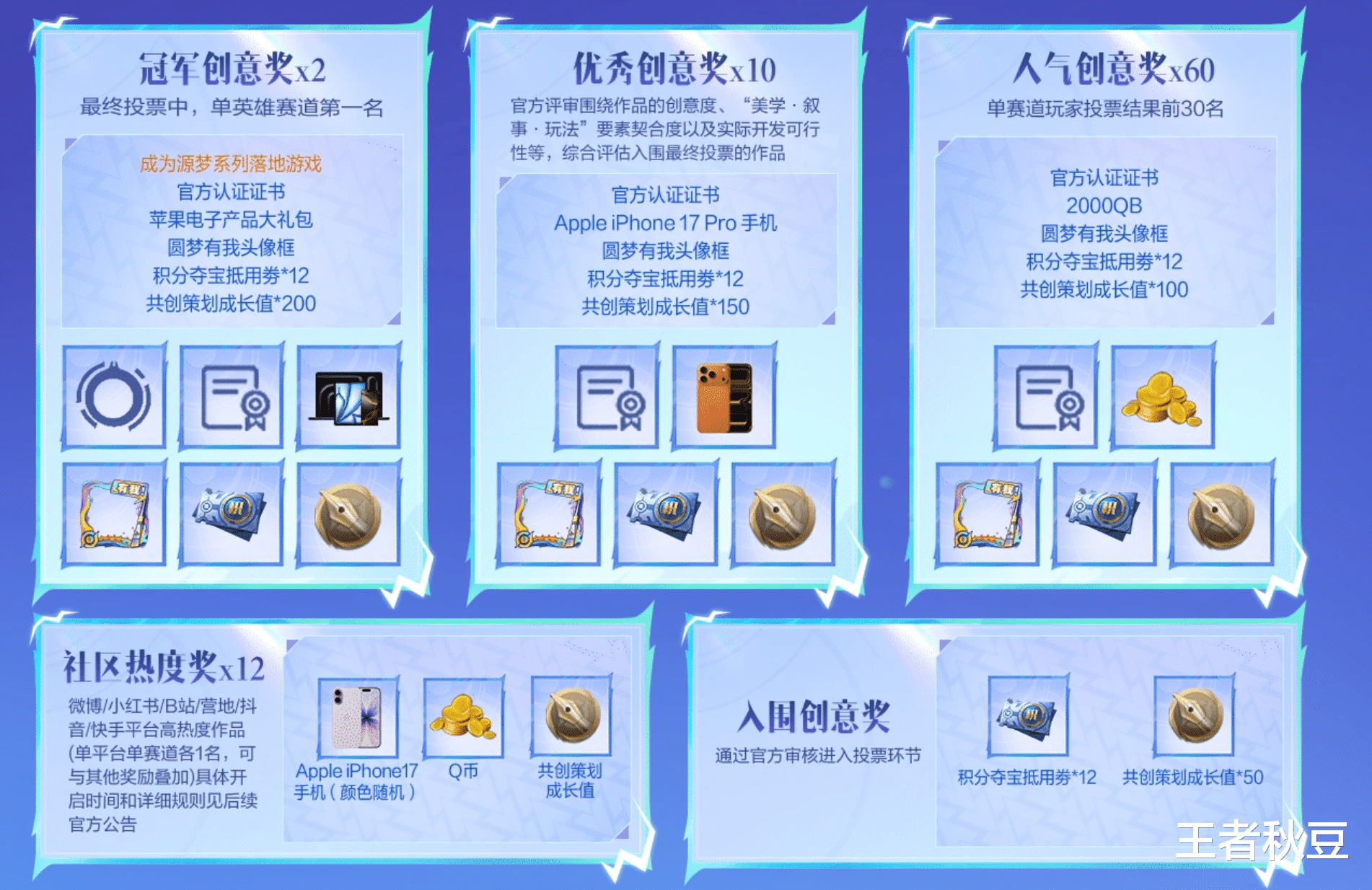 本次的奖励非常的丰厚,冠军创意奖的皮肤可以成为源梦落地皮肤外,还能获得苹果电子产品大礼包。还有10个优秀创意奖,可以获得苹果17Pro手机。还有60个人气创意奖,可以获得2000QB。就算最后大奖都没获得,入围创意奖也有12张积分夺宝券。
