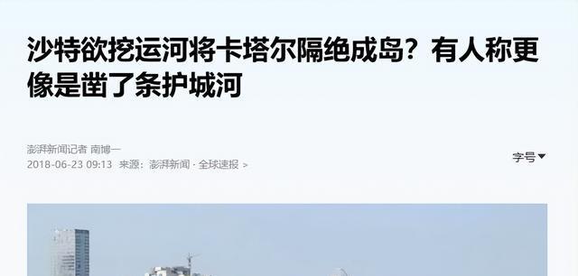 据澎湃新闻的消息,该事件见于2018年6月23日发布的报道《沙特计划开凿运河,意在将卡塔尔变为孤岛?有观点称这更似修建了一条护城河》。