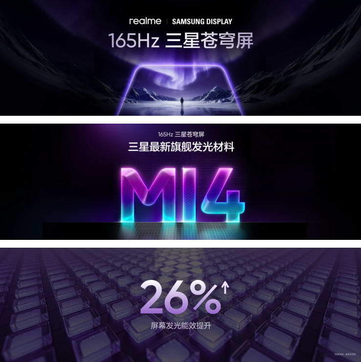 极致性能需要顶级屏幕来呈现。真我Neo8携手三星显示全球首发165Hz三星苍穹屏,采用M14旗舰发光材料,发光能效提升26%,165Hz功耗相比行业144Hz降低16%。