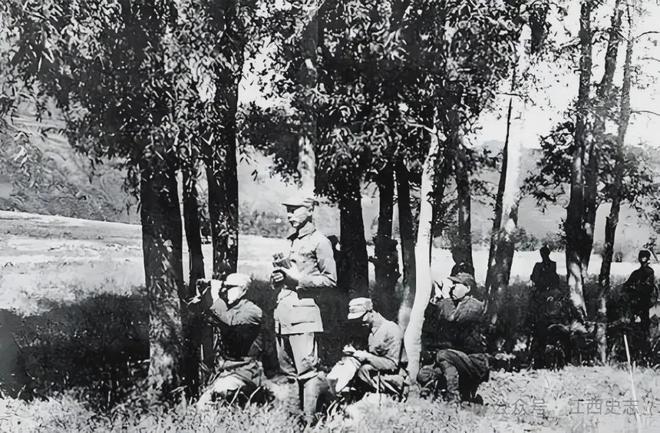 ▲战前,八路军第115师师首长在侦察地形。