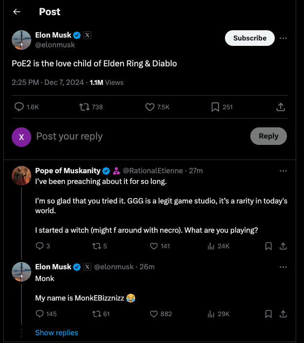 排队进场究竟有多火爆呢?就连埃隆·马斯克都连夜发文表示自己也在等POE2开服,并且祈祷自己能早点排队进去。有如此多的玩家几乎同一时刻一起尝试进入游戏,GGG不论搞来多么优秀的服务器,恐怕也很难同时承担如此激增的瞬时负荷。