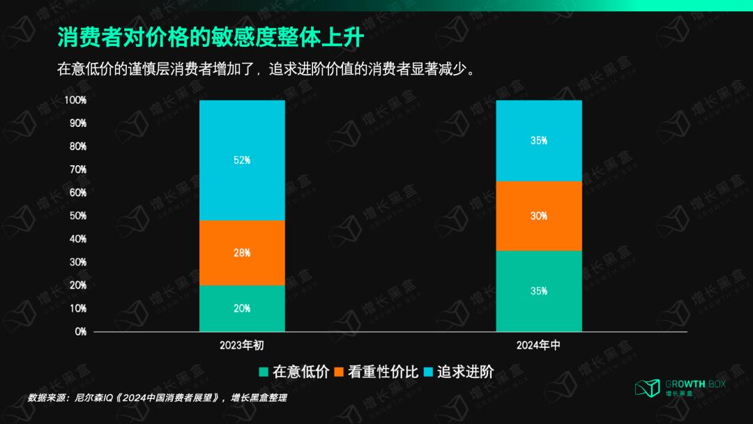 据尼尔森IQ《2024中国消费者展望》调研,与2023年初调研相比,消费者对价格敏感度整体上升,在意低价的消费者占比从20%上升至35%;看重性价比、多平台比价的消费者占比从28%上升为30%,而消费自由、追求进阶价值的消费者整体占比从52%下降至35%。[2]