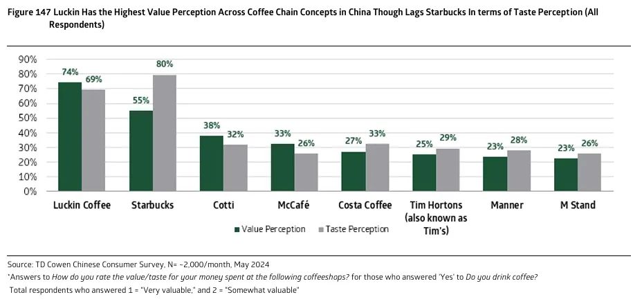 美国知名投行TD Cowen 今年5月的研究 发现,在中国快餐服务和咖啡连锁品牌中,星巴克的认知程度仍稳居第一。[6]