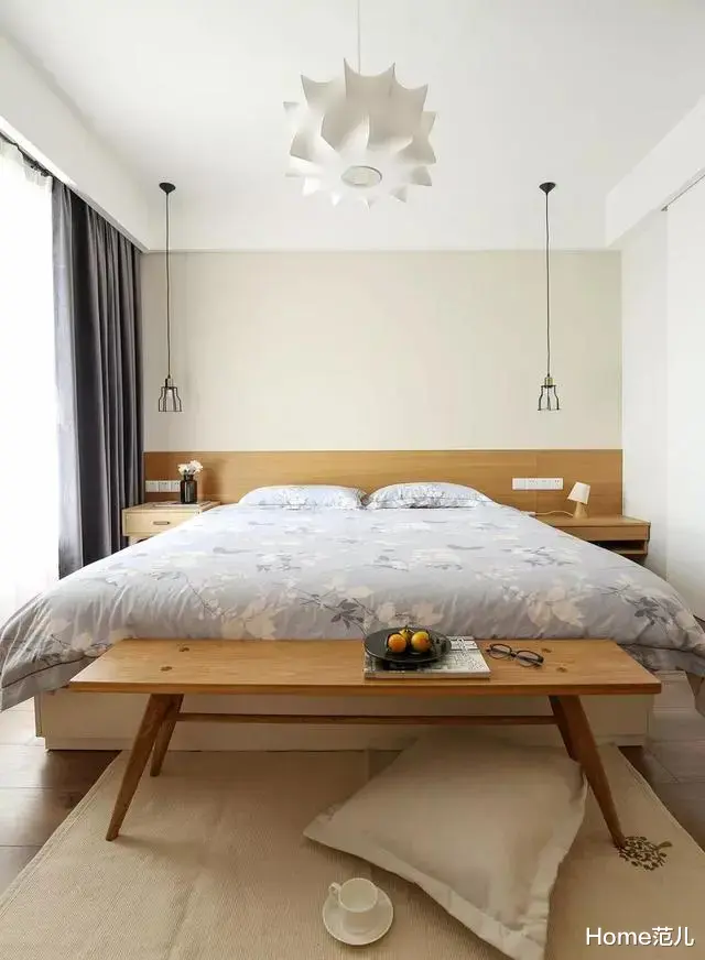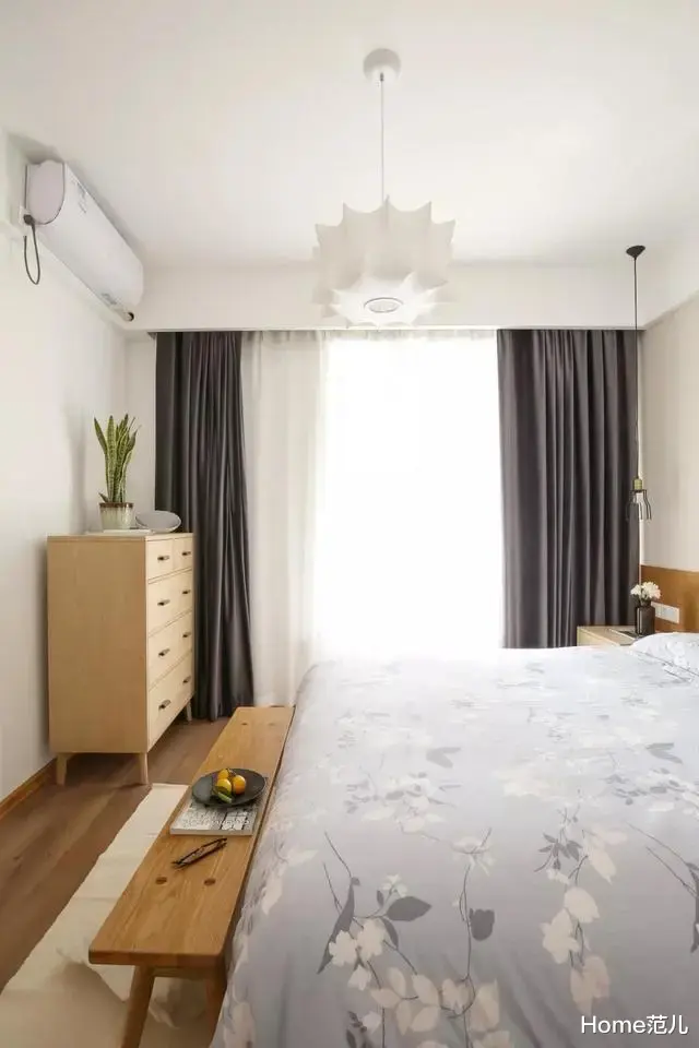 床尾的斗柜与落地窗的设计,既增加了收纳空间,又让卧室充满了自然光线。