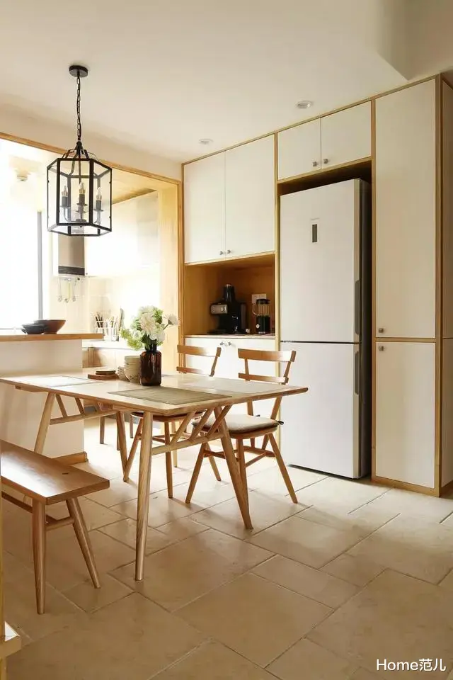 餐柜与鞋柜之间用冰箱进行分区,既方便了日常使用,又增加了空间的层次感。