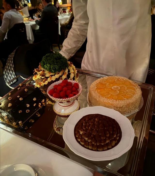 这顿饭的餐厅是梅费尔区一家连预约都得先验资的私厨,门口常年蹲着拍名人照片的代拍,一顿下来人均两千镑起步。四个小蛋糕看着萌,其实是意大利主厨手工翻糖,单个标价180镑,等于把“恭喜发财”直接写在了英镑上。