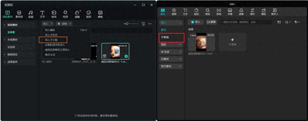 多工程导入能力(左:万兴喵影,右:CapCut)