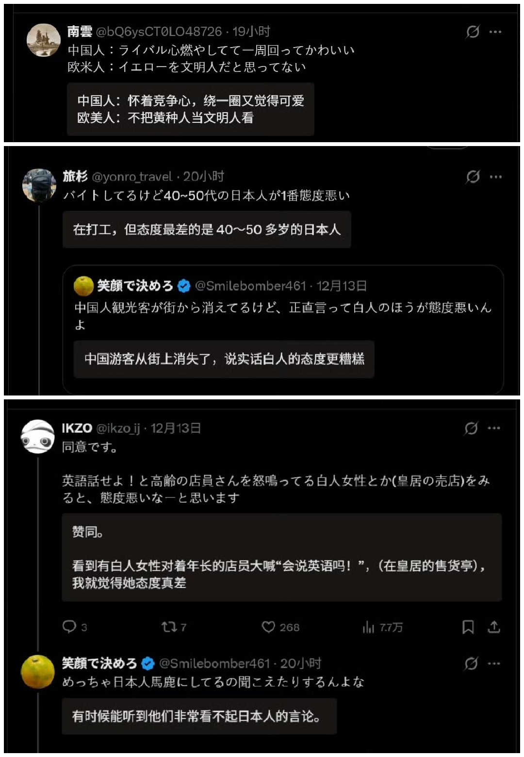 比较下来,还是中国游客更好一些,至少中国游客不会瞧不起日本人,不像白人不把日本人当成文明人。