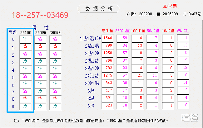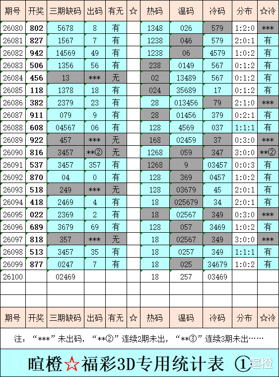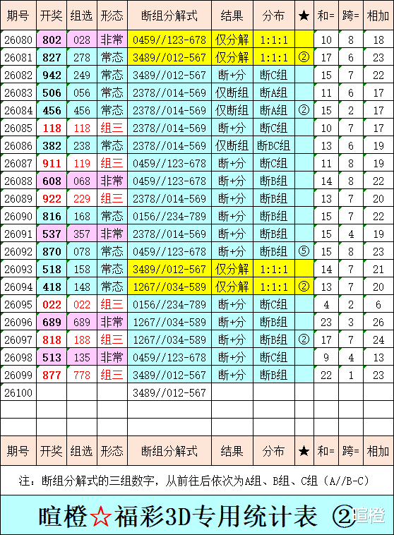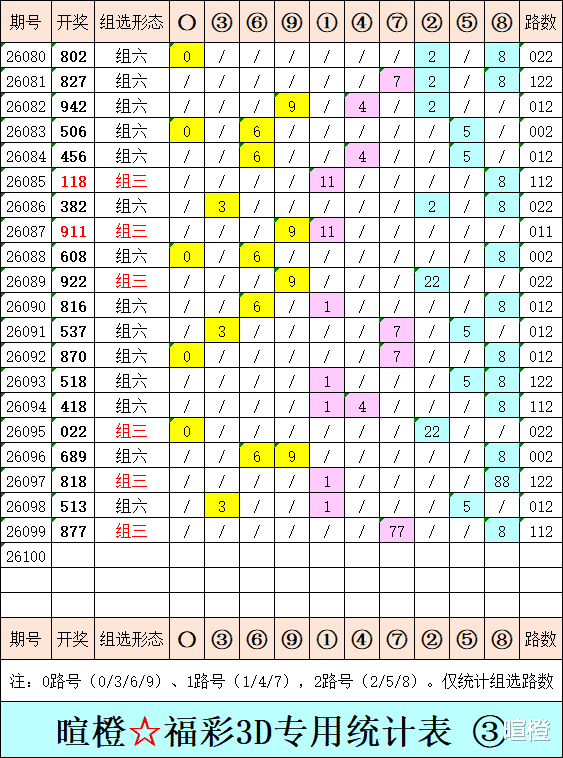 26100期:暄橙福彩3D综合条件(本期将在4月20日21:15开)一、上期回顾 ☆1、上期开奖号:8 7 7。2、和值= 22,跨度= 1。3、组三形态,112路组合。4、热度分布(热:温:冷)1:0:2。二、本期条件 ☆1、三期缺码:02469。2、热:18,温:257,冷:03469。3、断组分解式:3489//012-567。4、四胆:2356 ;三胆:356 。三、术语解释 ☆1、三期缺码:0至9这十个自然数当中,未在近三期开奖号出现的数字。2、热度(热温冷):自然数0至9,在近七期开奖号中,出现3次及3次以上的数字,称为热码;出现2次的数字,称为温码;出现1次和未出现的数字,称为冷码。某个数字在开奖号中出现几个,就按几次计算。3、断组分解式:将0至9这十个自然数,分成三组数字,从前往后依次为A组(4码)、B组(3码)、C组(3码),一般情况下,有一组数字不出码,偶尔会有两组数字不出码。A组不出码的情况相对较少。断组为主,分解为辅。4、常态组六号码:同时包含大数、小数、奇数、偶数、质数、合数的组六号码,共有72注。统计表中,简称“常态”。5、非常态组六号码:全大数、全小数、全奇数、全偶数、全质数、全合数等六种形态的组六号码,共有48注。统计表中,简称“非常”。★提醒:彩市有风险,参与须谨慎!水平有限,仅供参考!