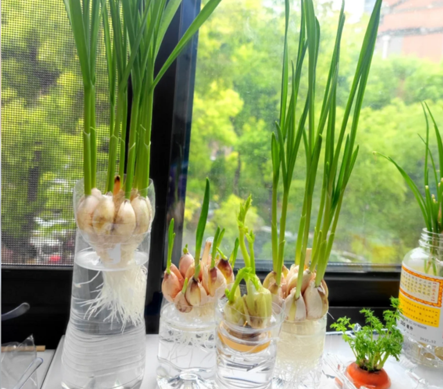 这样的水培蒜苗,既能随手操作,又容易照料,搞得家庭厨房变成了“绿色菜园”。