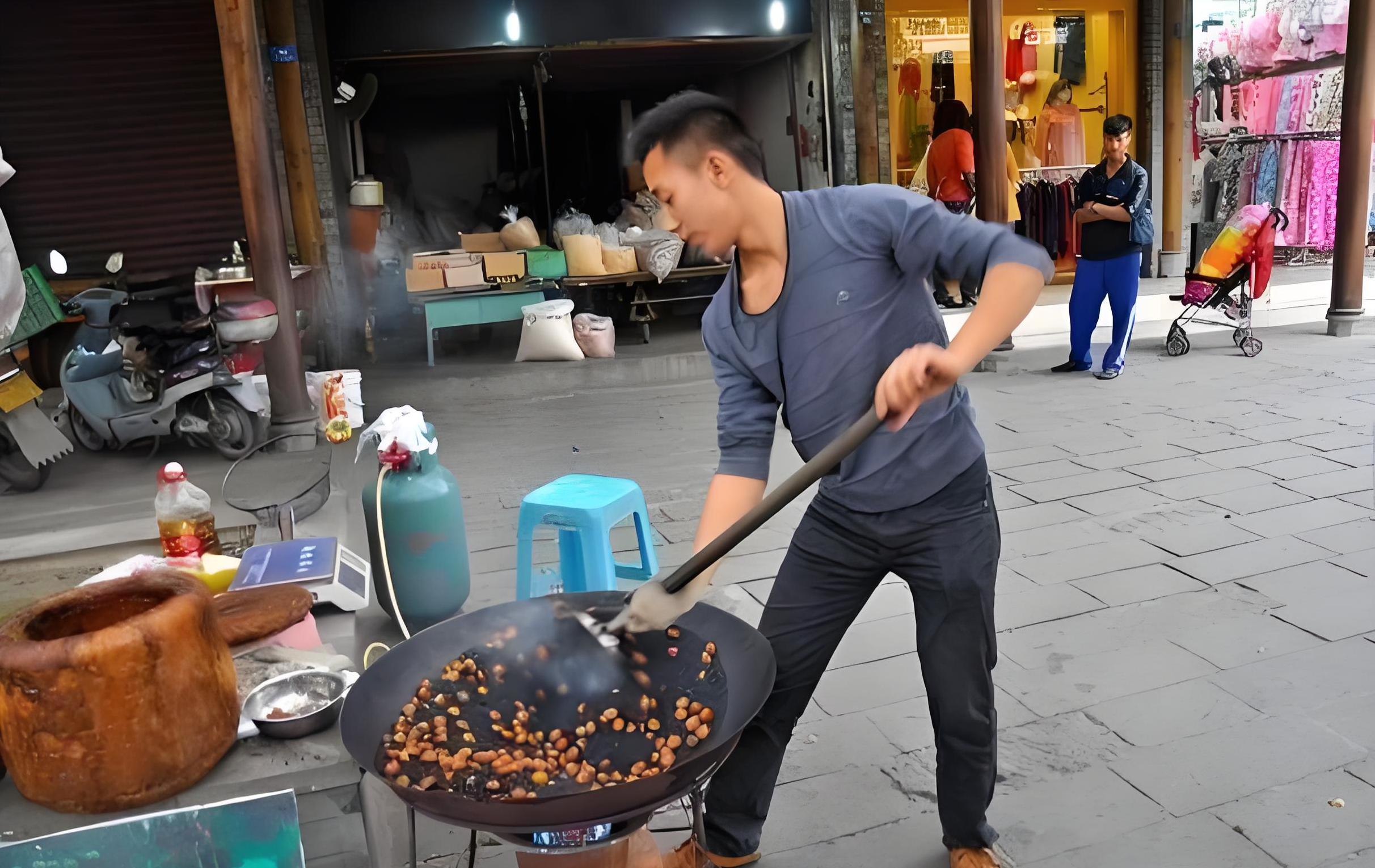 在热闹的夜市里,摊贩们叫卖着刚烤好的红薯,而旁边的地铁站口,一个中年男子用娴熟的手法将栗子从大锅里拿出来,装满小袋。