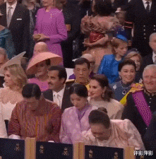 佩玛王后与不丹国王坐在汤加国王夫妇身边,汤加王后似乎是把观礼卡落在了地上,弯腰去捡,佩玛王后注意到汤加王后的举动。